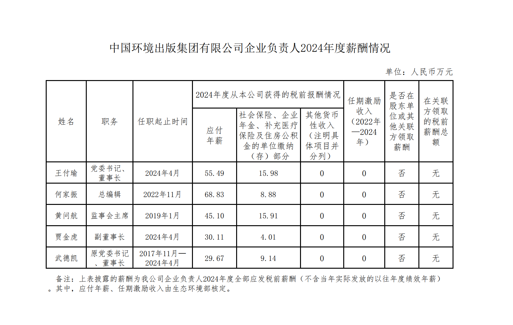 中國環境出版集團有限公司企業負責人2024年度薪酬情況
